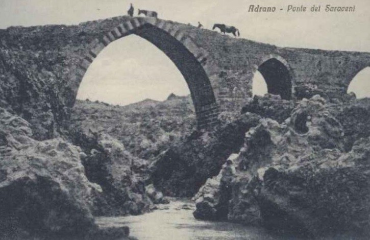 Come documenta lo studio di Sicilia Antica, la presenza di Paolo Orsi nell’antica “Adernò†– poi divenuta Adrano – risale al 1898, quando lo studioso arriva su invito di Salvatore Petronio Russo, sacerdote appassionato di storia ed archeologia che il 1° di aprile lo accompagna nei sopralluoghi dentro e fuori la cinta muraria di Adrano. Una “rapida passeggiata†di cinque ore circa, durante la quale Orsi annota puntualmente le sue impressioni sui monumenti visitati. Straordinaria la sua testimonianza sul paesaggio dell’Etna e del fiume Simeto che allora scorreva vorticoso sotto il Ponte dei Saraceni. Un’emozione che Orsi trasferisce puntualmente sul taccuino di viaggio, scrivendo: “Visito il ponte normanno sul Simeto detto Ponte dei Saraceni; panorama indimenticabile coi gorghi del fiume ed i monti verdi che ricordano, salvo il colore, le Alpiâ€.