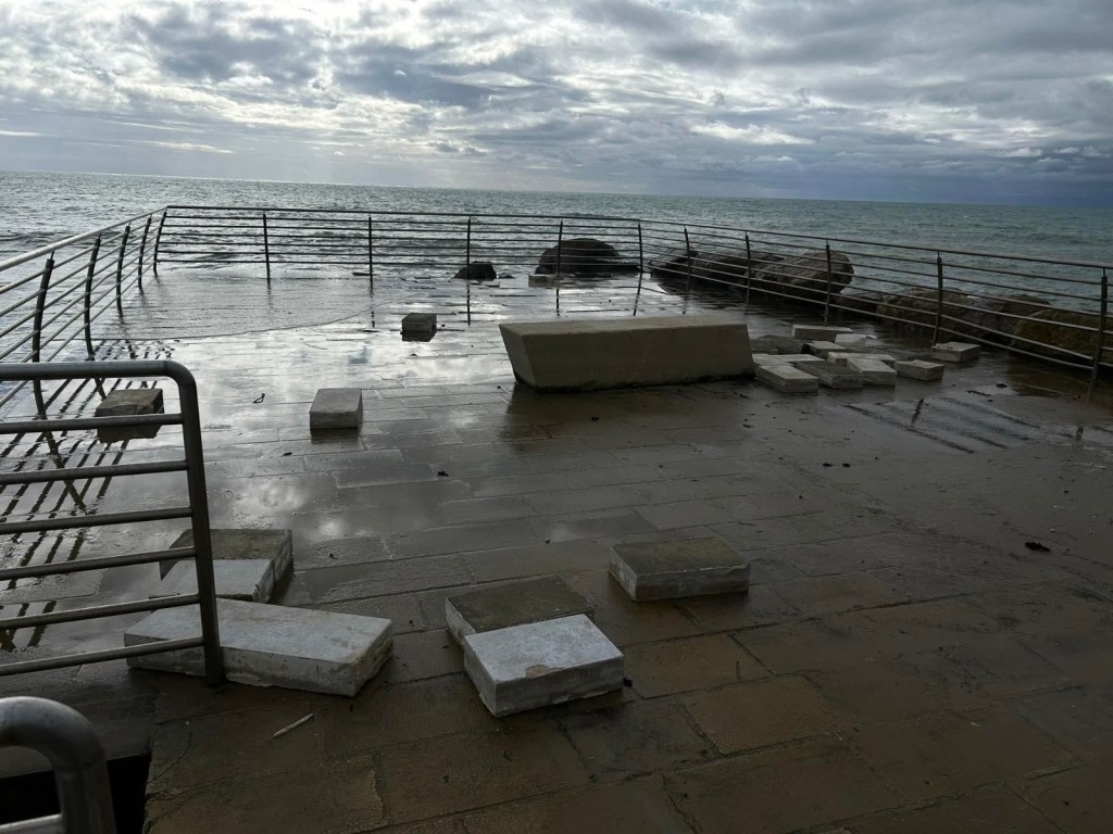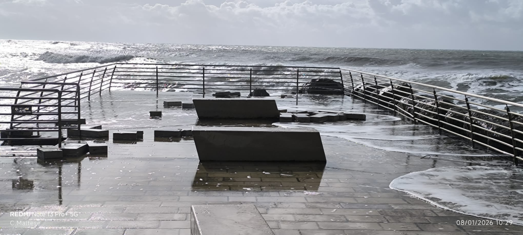 La furia del mare non ha risparmiato la piattaforma: numerosi blocchi in pietra della pavimentazione risultano completamente staccati dalla base, sparsi in modo disordinato lungo l’area del moletto. Ancora più evidente lo spostamento delle pesanti panchine in pietra, trascinate e disallineate dalla loro sede originaria, a testimonianza della violenza delle onde che si sono abbattute sulla struttura.