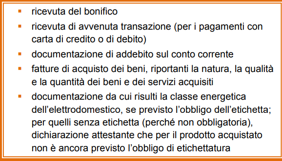 Deve trattarsi di grandi elettrodomestici, definizione in cui a titolo esemplificativo rientrano: frigoriferi, congelatori, lavatrici, lavasciuga e asciugatrici, lavastoviglie, apparecchi per la cottura, stufe elettriche, forni a microonde, piastre riscaldanti elettriche, apparecchi elettrici di riscaldamento, radiatori elettrici, ventilatori elettrici, apparecchi per il condizionamento.