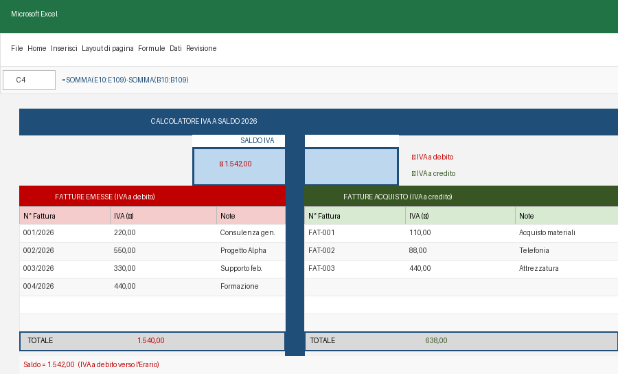 La formula calcola la differenza tra il totale IVA delle fatture emesse (colonna B) e il totale IVA delle fatture di acquisto (colonna F). Un risultato positivo indica IVA a debito verso l’Erario; un risultato negativo indica IVA a credito. Per rendere immediata la lettura, è possibile applicare una formattazione condizionale che colora il valore in rosso se positivo e in verde se negativo.
