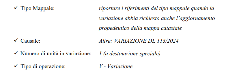 Il secondo è la dichiarazione di variazione Docfa (Documento Catasto Fabbricati), da presentare per ciascuna unità immobiliare censita. Per ciascuna area va indicato separatamente il valore di mercato ordinario e l’incremento percentuale, riportato con le seguenti diciture standardizzate: