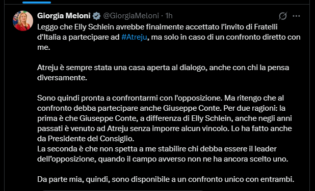 Così da Fratelli d’Italia il responsabile Organizzazione Giovanni Donzelli sfrutta l’assist: “Dispiace che Elly Schlein abbia anche quest’anno alla fine declinato l’invito ad Atreju. Come sempre la nostra festa è aperta a chiunque a prescindere da idee politiche e posizionamento culturale. Il confronto per noi è il sale dell’impegno politico e tutti gli ospiti sono ben accolti e graditi”, scrive. “Giorgia Meloni con disponibilità aveva anche accettato di cambiare l’impianto storico della festa per fare un confronto con Schlein e Conte, vista la disponibilità da entrambi dimostrata. Se questo non è possibile andiamo avanti con gli ospiti che parteciperanno senza porre condizioni e che ringraziamo per questo. Quando l’opposizione avrà un leader unico e riconosciuto da tutti saremo felici di accogliere ad Atreju un confronto diretto tra Giorgia Meloni e il leader individuato”, conclude provocatoriamente.