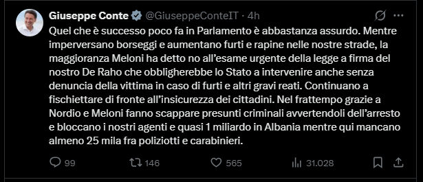 La proposta De Raho consentirebbe di risolvere il problema, ma evidentemente per la maggioranza il tema non è una priorità : la proposta di attribuire al provvedimento carattere d’urgenza – per accelerarne l’iter – è stata bocciata con 115 voti del centrodestra contro i 78 dell’opposizione. Così il leader 5 stelle Giuseppe Conte può infierire sui social: “Quel che è successo poco fa in Parlamento è abbastanza assurdo. Mentre imperversano borseggi e aumentano furti e rapine nelle nostre strade, la maggioranza Meloni ha detto no all’esame urgente della legge a firma del nostro De Raho che obbligherebbe lo Stato a intervenire anche senza denuncia della vittima in caso di furti e altri gravi reati. Continuano a fischiettare di fronte all’insicurezza dei cittadini. Nel frattempo grazie a Nordio e Meloni fanno scappare presunti criminali avvertendoli dell’arresto (grazie alla legge Nordio sull’interrogatorio preventivo, ndr) e bloccano i nostri agenti e quasi un miliardo in Albania mentre qui mancano almeno 25mila fra poliziotti e carabinieri”. Altrettanto duro il capogruppo pentastellato alla Camera, Riccardo Ricciardi: “Di fatto siamo davanti a una preoccupante combinazione tra noncuranza e incompetenza per i bisogni dei cittadini. Purtroppo ancora una volta Meloni e la sua maggioranza ci mostrano come per loro la sicurezza sia un qualcosa da sbandierare unicamente per tornaconto politico e di non essere in alcun modo interessati al crescere dei fenomeni di criminalità e violenza che stanno riguardando il Paese”.