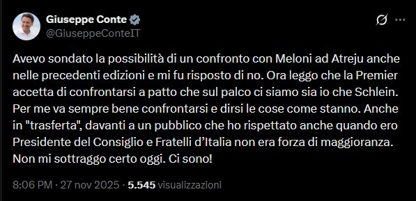 Una sfida che il presidente pentastellato accetta dopo pochi minuti: “Avevo sondato la possibilità di un confronto con Meloni ad Atreju anche nelle precedenti edizioni e mi fu risposto di no. Ora leggo che la premier accetta di confrontarsi a patto che sul palco ci siamo sia io che Schlein. Per me va sempre bene confrontarsi e dirsi le cose come stanno. Anche in “trasferta”, davanti a un pubblico che ho rispettato anche quando ero presidente del Consiglio e Fratelli d’Italia non era forza di maggioranza. Non mi sottraggo certo oggi. Ci sono!”, scrive in sui social. La leader Pd invece, ospite di Piazzapulita, non si mostra entusiasta dell’ipotesi e accusa la premier di voler fuggire dal confronto: “Mi dispiace che Giorgia Meloni abbia rifiutato di fare il confronto con me. Tanto più che l’anno scorso, prima delle Europee, aveva accettato di farlo. Mi viene da chiedere che cosa sia cambiato. Forse oggi faccio più paura, visti i risultati elettorali”, provoca, riferendosi alle regionali vinte in Puglia e Campania. “Se vuole fare il confronto di coalizione, portasse anche Matteo Salvini. E se vuole portare anche Tajani noi portiamo anche Fratoianni e Bonelli. È ridicolo“, accusa.