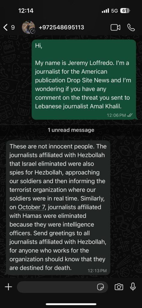 Con le Idf che si sono rifiutate di commentare l’accaduto, il reporter di Drop Site News, Jeremy Loffredo, ha provato a scrivere un messaggio al citato Gal Gideon Ben Avraham, autore delle minacce a Khalil. Ben Avraham risponde anche a lui: prima con un messaggio in cui lamenta “gli attacchi dei media” e poi con alcuni messaggi vocali in cui si propone di “spiegare la questione”. Lo Youtuber ripete in sostanza le accuse riferite a Loffredo, aggiungendo poi dei surreali elementi di pura propaganda, secondo cui Hezbollah impedirebbe ai giornalisti libanesi che lavorano in emittenti non affiliate al partito, come Al Jadeed o Mtv Lebanon, di fare il loro lavoro nel sud, e “uccide chiunque faccia il giornalista in canali non vicini a Hezbollah, accusandolo di propaganda sionista”, utilizzando quindi queste accuse come la prova che i cronisti sorpresi sul posto non possono che essere organici al Partito di Dio (che per lui significa terroristi, anche se sono dei civli, ndr).