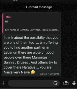 Lo scambio con Jeremy Loffredo va poi avanti, finché Ben Avraham decide di mandargli un chiaro avvertimento, non prima di rivelare – forse in modo involontario? – quale sia la logica prettamente settaria utilizzata dalle Idf che punta a creare fratture all’interno della multiconfessionale società libanese e prende di mira l’intera comunità sciita – con l’obbiettivo che non faccia mai più ritorno al sud – nella consapevolezza che la stragrande maggioranza dei suoi appartenenti sostengono (ed anche un sostegno “emotivo” è sufficiente) il ruolo di Hezbollah: “Sto pensando alla possibilità che anche tu sia uno di loro. Ti sto consigliando di trovare dei partner diversi in Libano. Ci sono tante persone perbene lì, tra i maroniti, tra i sunniti, tra i drusi e altri. Cerca di adottare la loro, di narrativa. Sei molto, ma molto ingenuo”.