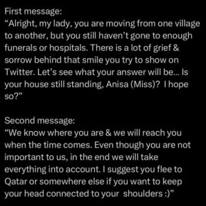 “Ok, cara. Ti stai muovendo da un villaggio all’altro, ma non sei ancora stata in ospedali o funerali a sufficienza. Ci sono molto dolore e tristezza dietro a quel sorriso che provi a mostrare su Twitter. Vediamo quale sarà la tua risposta. La tua casa è ancora in piedi, Anisa (compagna, ndr)? Lo spero”, gli aveva scritto il podcaster. Che poi aveva continuato: “Sappiamo dove ti trovi e ti raggiungeremo a tempo debito. Anche se per noi non sei importante, alla fine faremo le nostre considerazioni. Ti suggerisco di trasferirti in Qatar o da qualche altra parte, se vuoi che la tua testa rimanga collegata alle tue spalle”, diceva Ben Avraham che si descrive come un ex sergente delle Idf che “continua ad aiutare l’intelligence israeliana”.