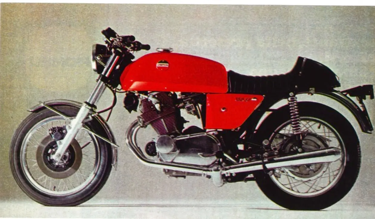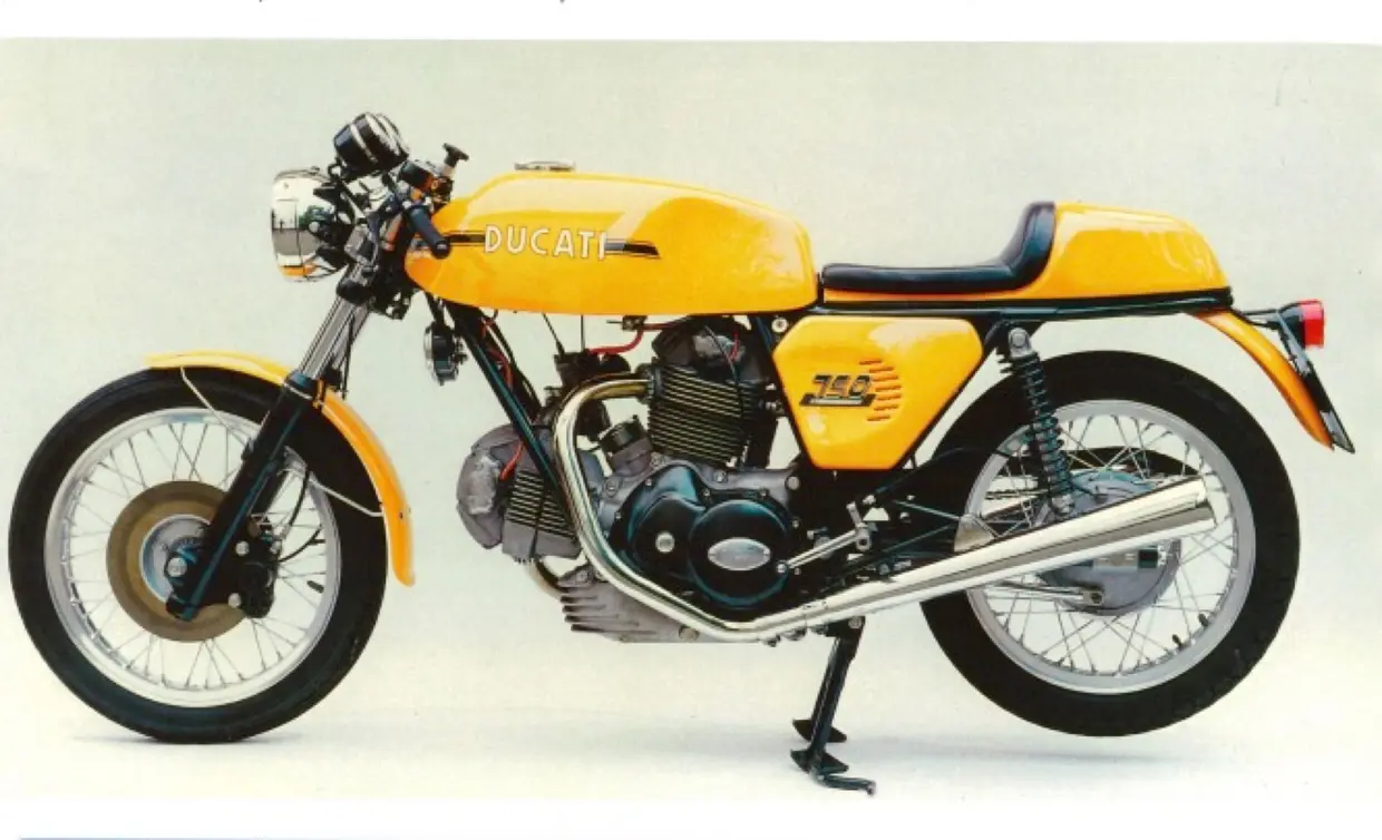 Questa bicilindrica con la mezza carena è una vera e propria sportiva nata dalle corse e infatti la sua fama nasce dalla doppietta Smart-Spaggiari alla 200 Miglia di Imola del 1972. La vittoria della 750 preparata con la supervisione dell'ing. Taglioni fu un ottimo pretesto per dar vita, l'anno successivo, alla versione stradale che celebrava quel successo con dettagli racing come la striscia trasparente sul serbatoio per controllare il carburante, i tre freni a disco (due davanti e uno dietro, rarità per l'epoca), il manubrio ribassato, le pedane arretrate e il sellino monoposto. La sua vera particolarità , però, era la distribuzione desmodromica, che su un bicilindrico Ducati non si era ancora vista: con una cilindrata di 747,95 cm3, il raffreddamento ad aria e i due carburatori Dell'Orto PHM da 40 mm riusciva ad erogare 70 CV di potenza a 8.800 giri/min. Pensate che riusciva a raggiungere i 214 km/h di velocità massima, con un scatto sul quarto di miglio (400 metri circa) di 12,2 secondi.