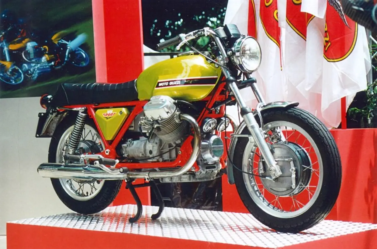 Arrivata nel 1971, questa versione della V7 nasce proprio dall'esigenza della casa di Mandello di inserirsi nel segmento delle maxi, tanto desiderate dal pubblico alla ricerta di emozioni. Il compito viene affidato all'ing. Lino Tonti che, nonostante la "guerra" interna con la dirigenza per contenere i costi, riuscì a sfornare un mezzo eccellente, tanto che la stampa dell'epoca ne tesse le lodi. La V7 Sport era molto compatta, merito del telaio in tubi di acciaio sviluppato "ad hoc" che riusciva a offrire una stabilità ben al di sopra della media. La ciclistica era, senza ombra di dubbio, di riferimento per la categoria anche se aveva un grossissimo difetto: il freno anteriore era ancora a tamburo e, di conseguenza, la frenata non era all'altezza delle concorrenti che avevano già il disco.