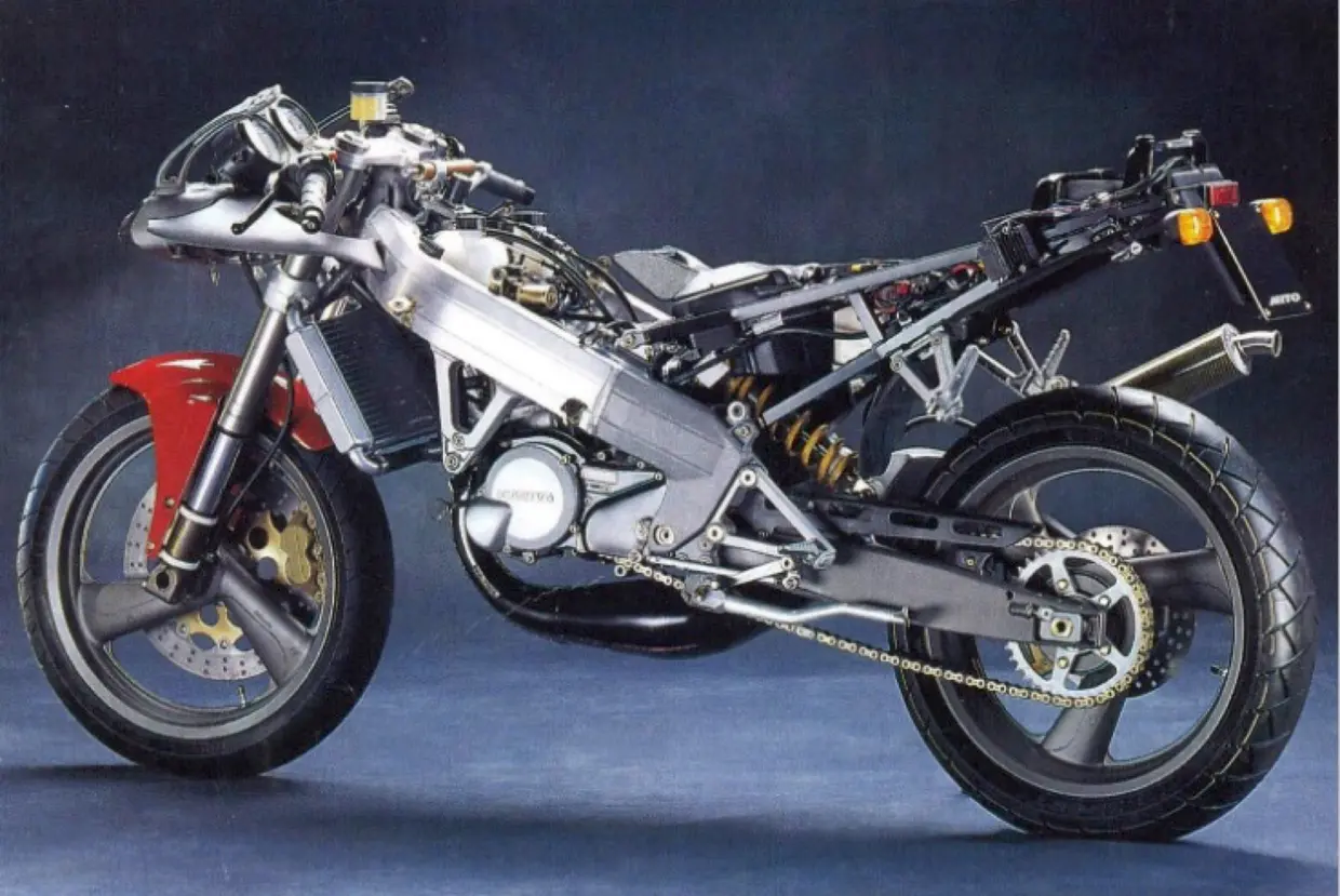 Il telaio è a doppio trave in estruso di alluminio, un capolavoro, così come il forcellone, sempre in alluminio e caratterizzato dal braccio destro a banana per far spazio al controcono dell'espansione di scarico. Il motore monocilindrico con raffreddamento a liquido ha un alesaggio x corsa di 56 x 50,6 mm, un rapporto più superquadro rispetto a quello dell'Aprilia. Ancora oggi molto apprezzato il cambio a 7 rapporti, marchio di fabbrica della Mito, anche se poi nella pratica non dava vantaggi apprezzabili.