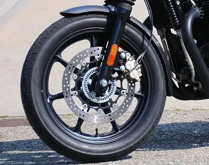 La ciclistica è classica: forcella tradizionale con soffietti e doppio ammortizzatore posteriore con serbatoio separato. L’impianto frenante è firmato ByBre, con disco anteriore da 320 mm.