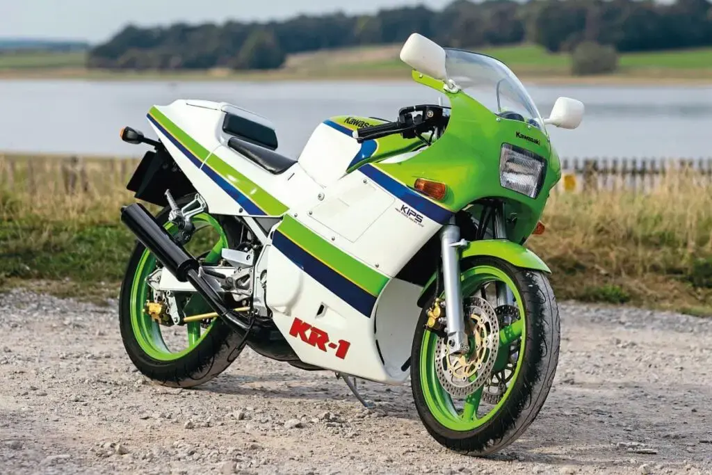 Anche la verdona a 2 tempi è una vera rarità perché la produzione di tutti i modelli (dal 1988 al 1992) è stata inferiore alle 10.000 unità in tutto il mondo. La KR-1 era caratterizzata da una linea molto bilanciata e da prestazioni eccellenti: il telaio in alluminio abbracciava un motore bicilindrico con alesaggio x corsa di 56 mm x 50.6 mm e, grazie ai due carburatori Keihin PWK 28, la potenza arrivava a 52 CV a 10.500 giri/min. Nel 1991, la casa di Akashi presenta le versioni S e R, con quest'ultima valorizzata da due Keihin PWK 35 che garantivano un'incremento di 3 CV, un telaio più rigido e gomme più grandi. Peccato la KR-1 non si sia mai troppo evoluta, infatti anche gli ultimi modelli prodotti montavano dettagli "old style" come la forcella a steli tradizionali.