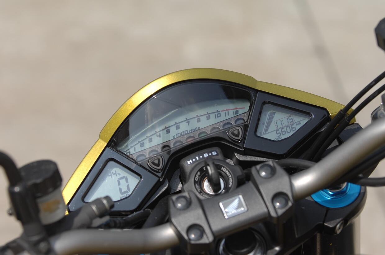 Il motore quasi sorprende perché ha una buona risposta anche ai medi regimi, cosa rara per un 600 quattro cilindri di origine sportiva (deriva da quello della CBR 600 RR). Il grosso cruscotto sopra il faro non è bellissimo da vedere, però toglie un po’ di aria dal petto del pilota migliorando il comfort quando si viaggia in autostrada.