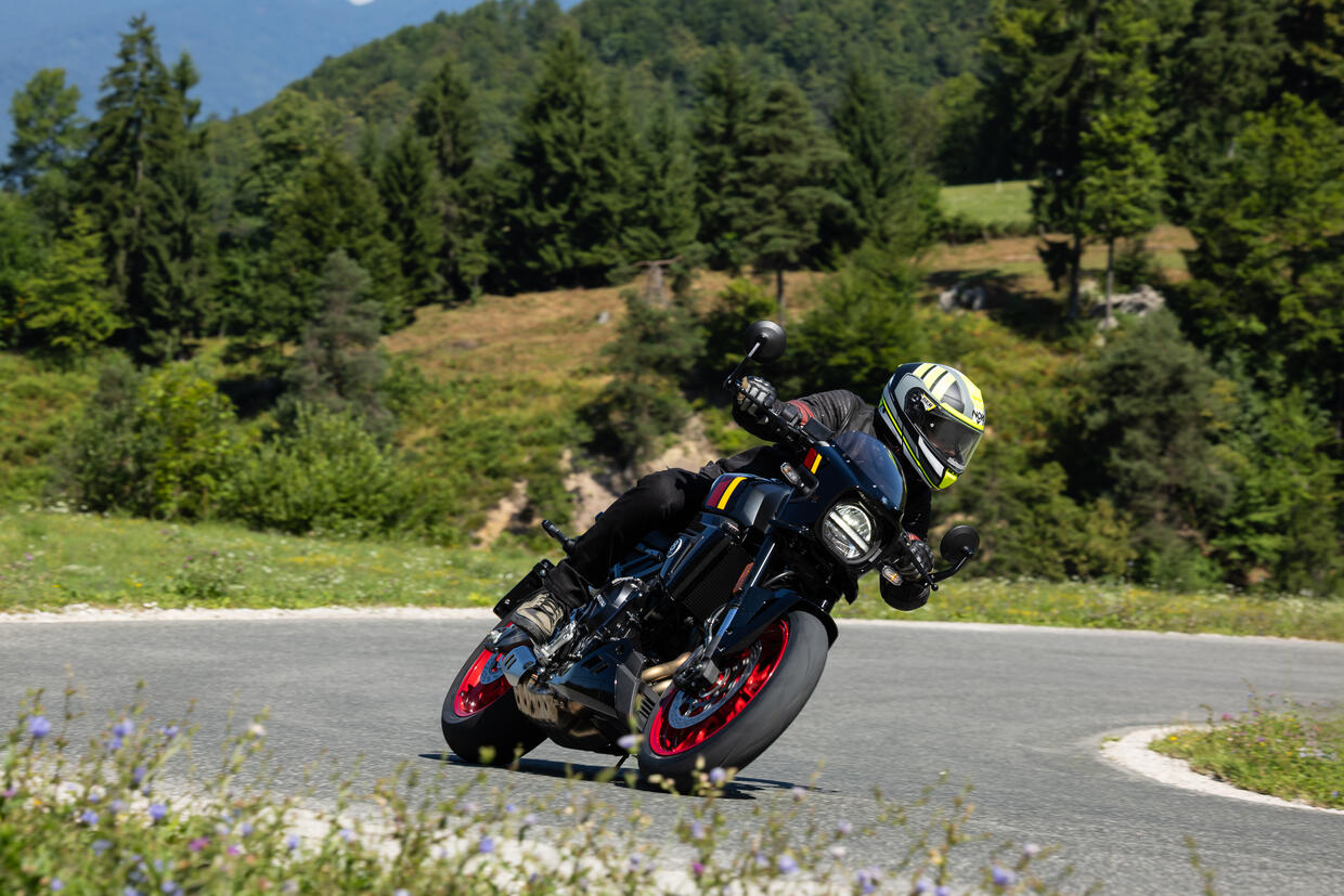 Il bicilindrico parallelo da 776 cm³, che sulla carta dichiara 83 CV, si conferma un motore brillante anche al banco prova. I nostri rilevamenti alla ruota mostrano valori robusti, ma ciò che colpisce è la curva di erogazione: il picco di coppia arriva a soli 5.600 giri, ben prima di quanto dichiarato (6.800 giri). Questo si traduce in una spinta corposa e immediata fin dai bassi regimi, rendendo la 8TT reattiva e appagante nell'uso stradale, perfetta per uscire veloci dalle curve senza dover strapazzare il cambio.