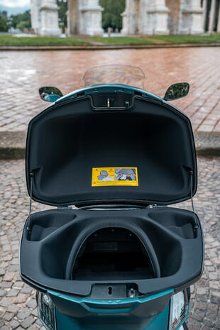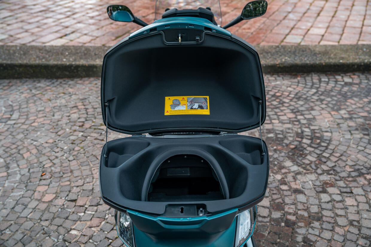 Il bauletto da 54 litri integrato nella carrozzeria può contenere due caschi integrali. è collegato al vano sottosella, che così accoglie oggetti lunghi fino a 90 cm