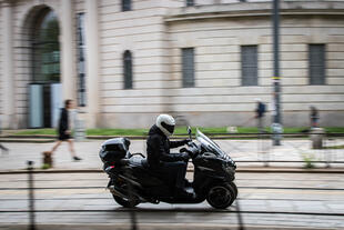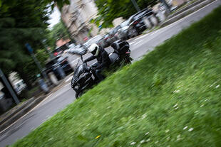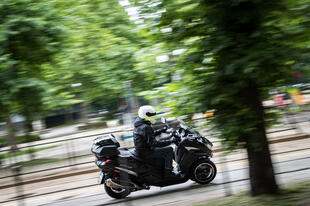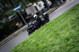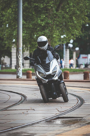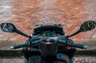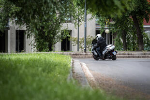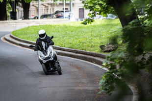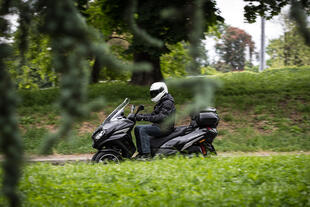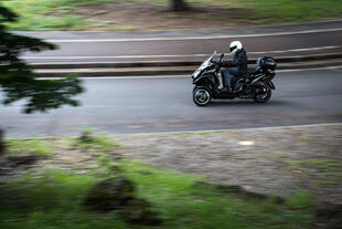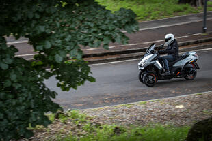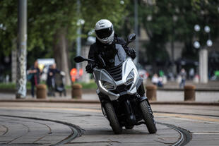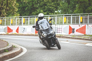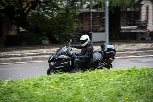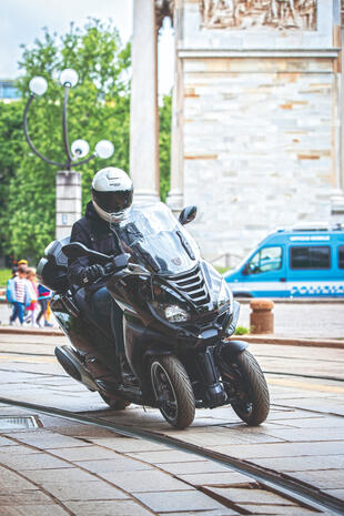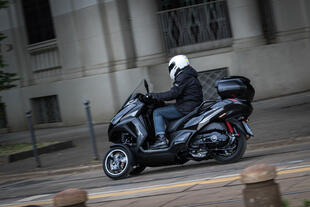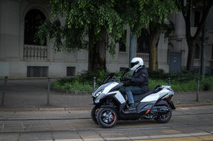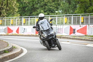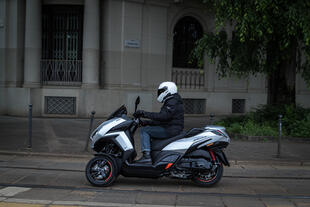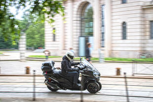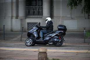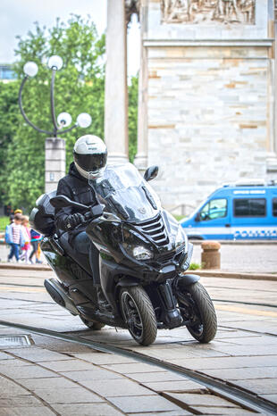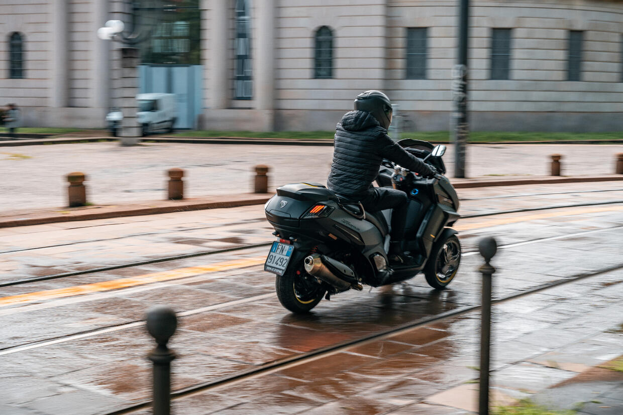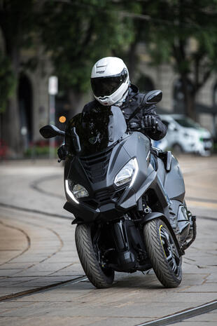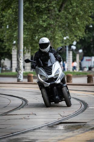 La posizione di guida è comoda: la sella è ampia e c’è tanto spazio per le gambe e i piedi. Peso e dimensioni sono da maxi, eppure una volta in movimento si sentono poco e in città , dopo averci preso la mano, ci si muove con grande disinvoltura. In curva le due ruote anteriori si sentono: il Metropolis è preciso e progressivo nei cambi di direzione. Il motore spinge bene ai bassi, resta pieno ai medi e mantiene con facilità andature autostradali. La trasmissione è fluida e ben accordata. Nelle frenate decise, oltre allo stop, si attivano le 4 frecce e un segnale acustico. Il controllo di trazione è ben a punto e aumenta la sicurezza sui fondi con poca aderenza. Efficace la protezione del parabrezza, ben tarate le sospensioni.