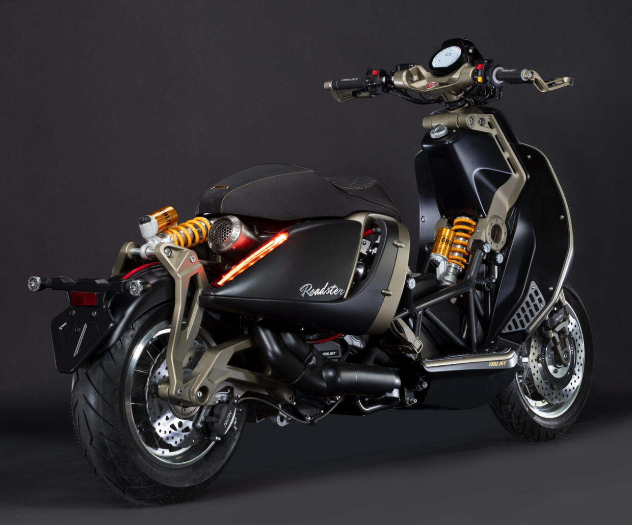 Italjet dopo il Dragster ha deciso di stupire ancora proponendo un veicolo che sfoggia un’estetica di stampo vintage, ma con soluzioni tecniche fuori dal comune. La carrozzeria è stata progettata limitando l'uso delle plastiche: la struttura e gran parte dei componenti a vista sono realizzati in acciaio e alluminio, una scelta mirata per dare solidità ma anche per rendere lo scooter esclusivo.