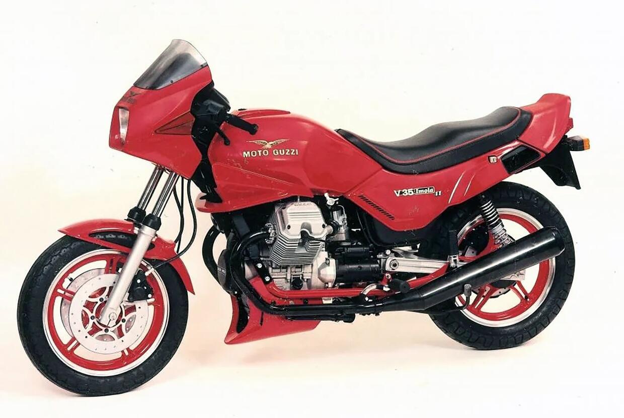 Verso la fine degli anni ‘70 la Moto Guzzi ricavò una versione ridotta del suo motore bicilindrico a V di 500 cm³ per rientrare nella fascia meno tassata e guidabile anche da chi non aveva ancora compiuto 21 anni. Vennero prodotte numerosissime versioni della V 35 di 350 cm³, custom, turistiche e anche sportive. Le due denominate Imola e Imola II furono tra le più apprezzate. La prima restò in gamma dal 1979 al 1983, la seconda dal 1984 al 1987. Erano sportive non esasperate ma piacevoli e impiegavano lo stesso solido telaio di tutta la serie V 35. Cupolino e semi manubri, nella seconda versione anche il puntale, erano stabili ma non troppo maneggevoli, la prima con motore a 2 valvole (qui sopra) non brillava per le prestazioni ma aveva una buona affidabilità , la seconda con motore a 4 valvole (qui sotto) era più potente ma molto più fragile: la distribuzione 4V è di cristallo, ed è meglio farla girare ben al di sotto del regime massimo.