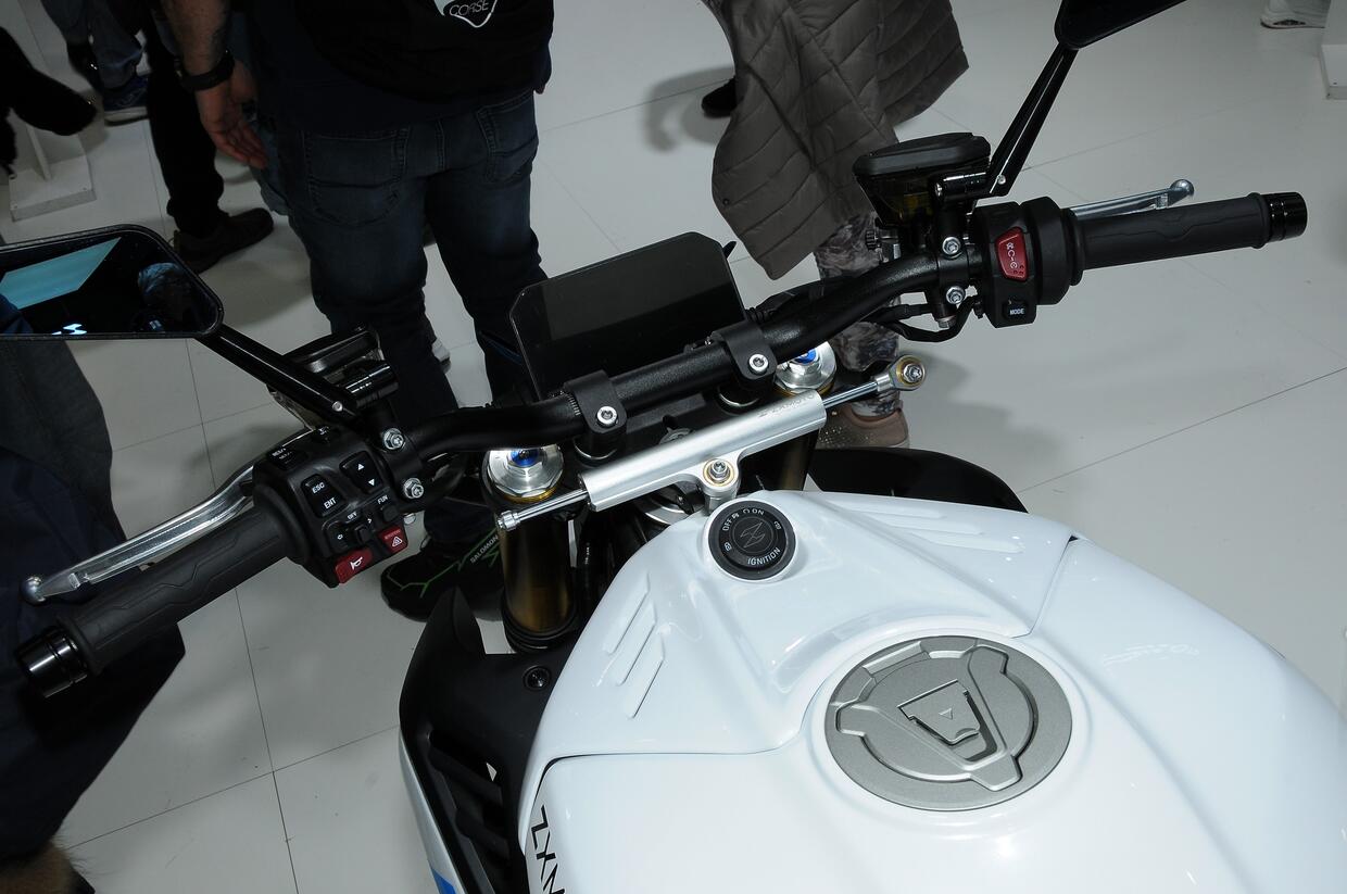 Il manubrio largo e basso è da vera streetfighter. Tra le varie "chicche" c'è anche l'ammortizzatore di sterzo.