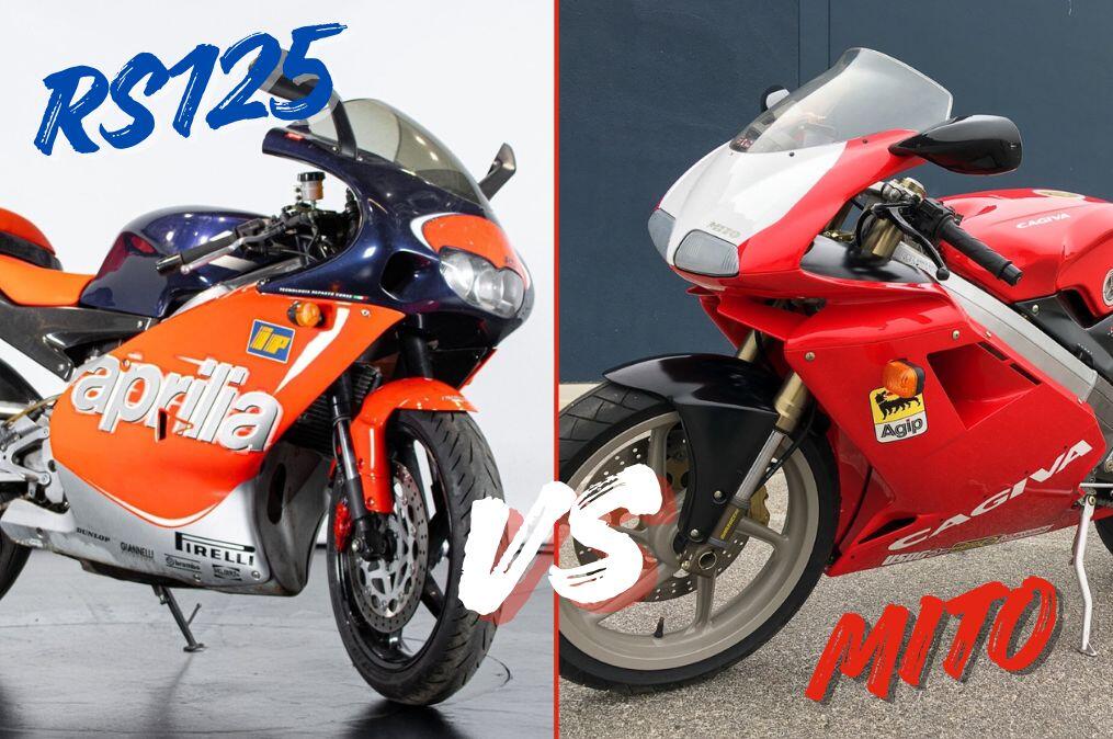L'era d'oro dei 125 è quella degli anni '90, ve lo abbiamo già detto più volte con nostalglia e magari alcuni di voi hanno avuto anche la fortuna di vivere quel periodo in prima persona, quando tra le 125 a 2 tempi c'era l'imbarazzo della scelta... Aprilia, Cagiva, Honda, Yamaha, Gilera. Erano una più bella dell'altra ma, se proprio dovessimo eleggere una regina, allora dovremmo parlare di duello e, tra l'altro, tutto tricolore perché solo due modelli sono riusciti a sopravvivere ai limiti imposti di potenza (al massimo 15 CV a partire dal 1998) e alla crescita dei motori a 4 tempi anche tra le ottavo di litro. Stiamo parlando, ovviamente della RS 125 e della Mito, qual è la più veloce? Prima facciamo un rapido riassunto della storia di questi due missili a miscela, poi le mettiamo a confronto con i rilevamenti alla mano!