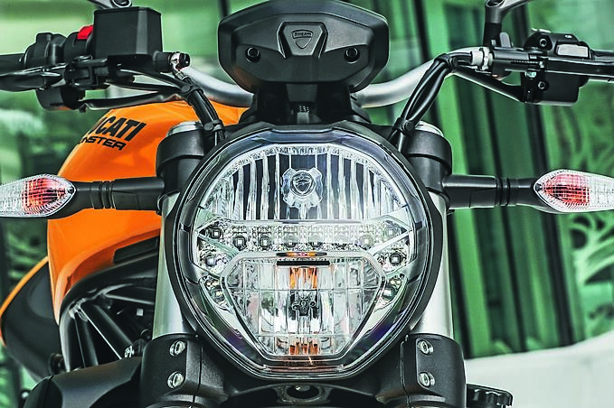 La Monster ha sempre avuto il faro tondo, ma nella 821 le luci di posizione sono a LED. La forcella a steli rovesciati da 43 mm non è regolabile
