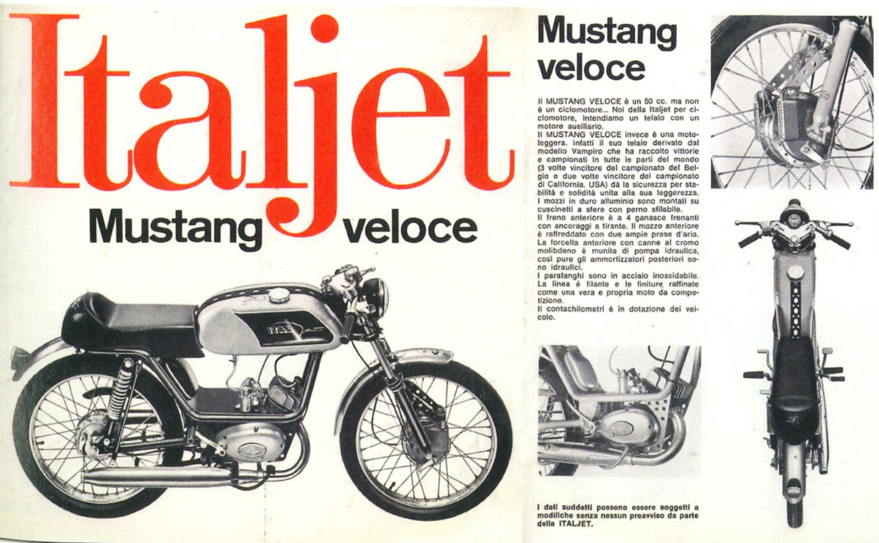 Il primo a vedere la luce è il Mustang SS, presentato nel 1965. Per il motore Italjet si affida a Minarelli, adottando il collaudato P4 a quattro marce. Con carburatore da 17 mm e una potenza di 4,2 CV a 8.100 giri, il piccolo SS supera i 90 km/h: numeri di tutto rispetto per una 50 dell’epoca. Ok le prestazioni, di tutto rispetto, ma a colpire sono soprattutto la cura costruttiva e l’aspetto da vere moto da corsa: cerchi in alluminio, leve con testa sferica, pedane supplementari per una posizione più raccolta, freno anteriore a quattro ganasce da 118 mm con prese d’aria (finte), che fanno sentire grandi. Ciò detto, va comunque ammesso che, almeno la prima serie, rimane esteticamente piuttosto sobria: telaio nero, serbatoio e parafanghi in alluminio, bombature nere sotto i tappi e svasature per le ginocchia. Le tinte più vivaci e corsaiole (quelle che fanno sognare i GP), in rosso con bordo nero o argento con inserti laterali, finiscono soprattutto sui mercati esteri, Germania in testa, dove alcuni esemplari adottano anche il Sachs a cinque marce da 5,2 CV a 9.500 giri.