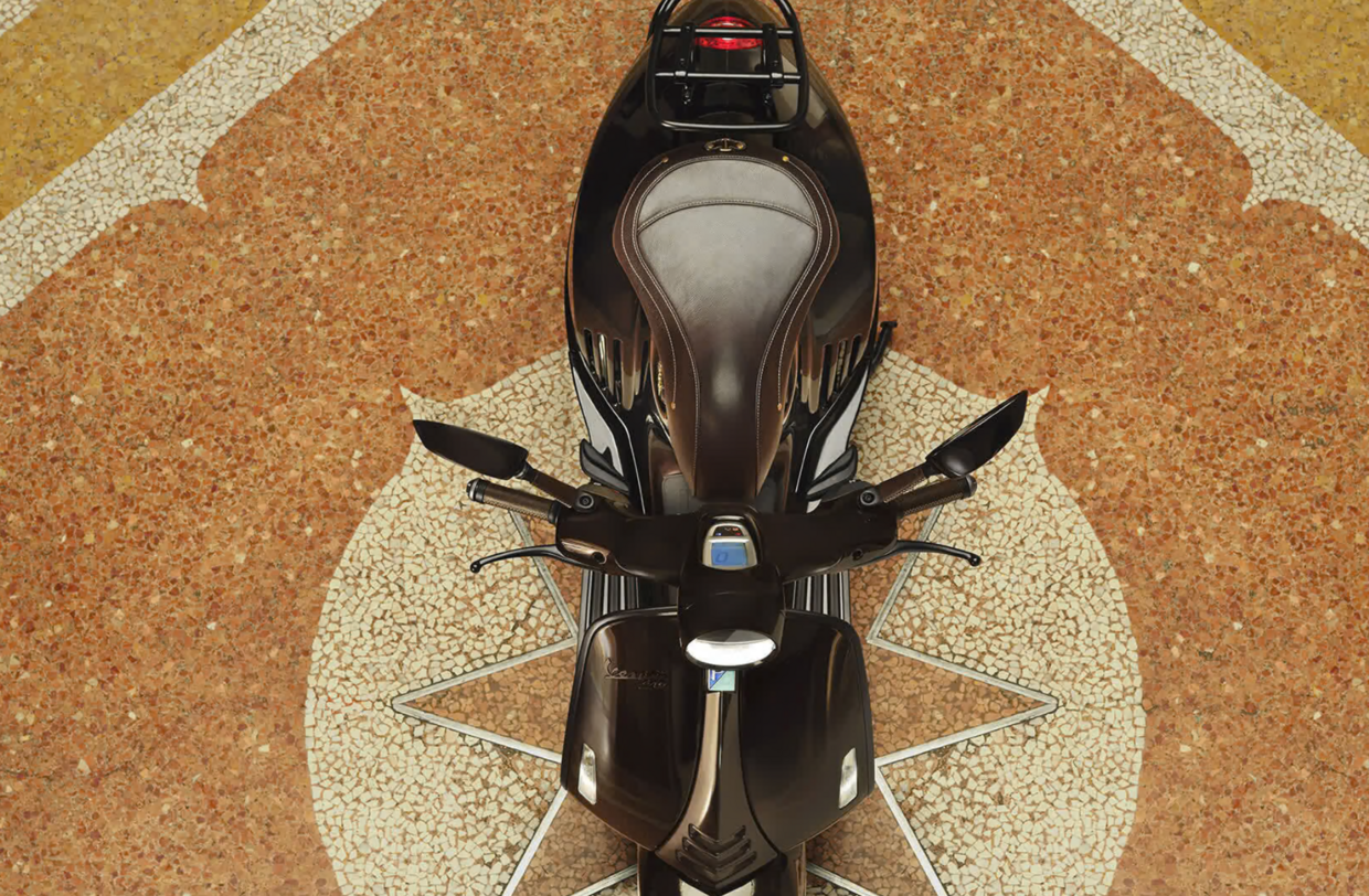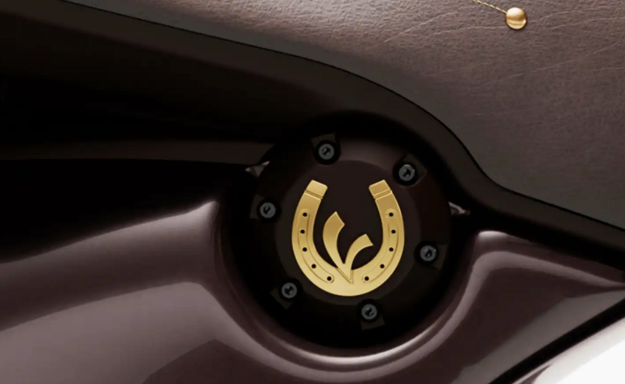 La colorazione esclusiva si chiama “Bayâ€, descritta da Piaggio come un marrone scuro brunito con riflessi dorati alla luce del sole. Gli interventi più evidenti si concentrano nella zona della sella monoposto, rivestita in vera pelle color marrone scuro, con cuciture a contrasto gialle, borchie dorate e una fibbia centrale nella parte posteriore. Sotto la sella, sul lato destro, trova posto un emblema a forma di ferro di cavallo dorato, integrato con la “V†di Vespa.