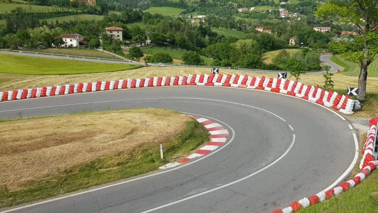 Qui emerge la sua caratteristica piĂš insolita: i cordoli ai lati della carreggiata, un elemento praticamente unico su strada aperta al traffico. Il ritmo sale quasi senza accorgersene, complice lâottima leggibilitĂ delle curve e la qualitĂ del fondo.