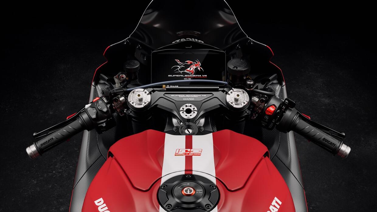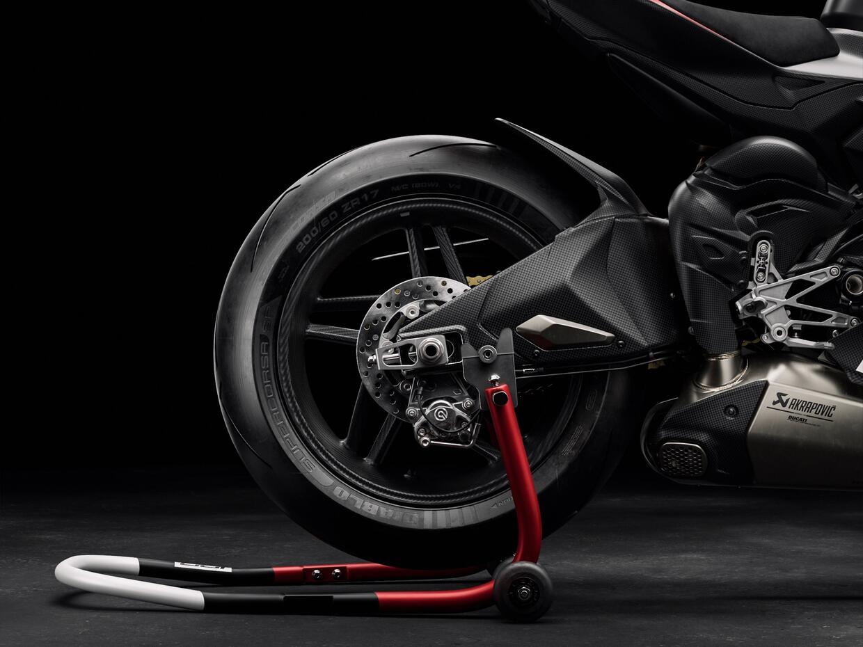 Tutto è pensato per cercare di contenere il peso, in linea con la filosofia di una moto che non a caso si chiama Superleggera: i cerchi a cinque razze hanno permesso di risparmiare 300 g rispetto a quelli della Panigale V4 S Carbon, il telaietto anteriore pesa 200 g in meno e il monoscocca posteriore addirittura 1,4 kg in meno.