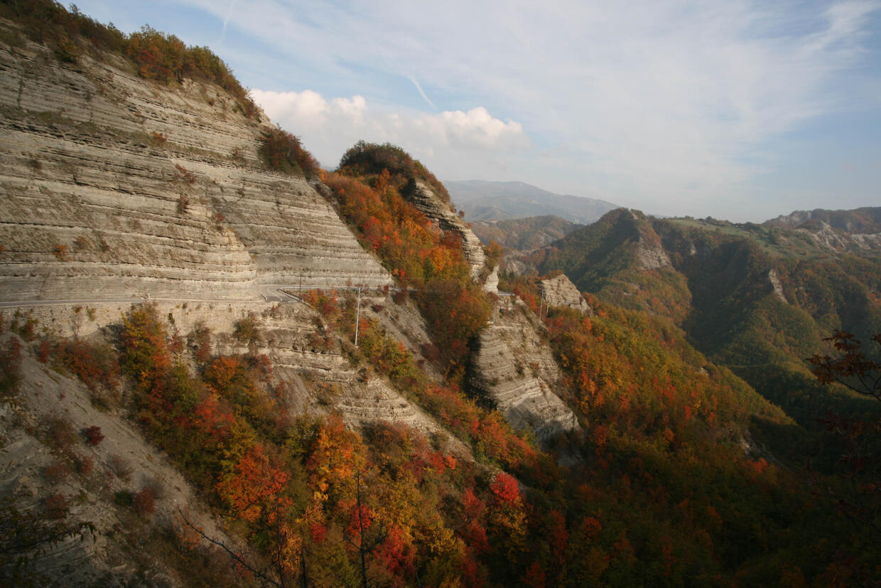 Il percorso inizia a Bagno di Romagna, celebre e rinomato centro termale immerso nell’alta valle del Savio. La strada si snoda inizialmente tra dolci colline e boschi ombrosi, con un leggero saliscendi che permette di prendere confidenza con l’asfalto e, man mano che ci si avvicina al passo, la salita diventa più ripida e le curve più frequenti. Una delle attrazioni geologiche più note del tratto è quella delle Scalacce, affioramenti rocciosi di tipo sedimentario che mostrano chiaramente la stratificazione dell’Appennino. Il dislivello complessivo dal versante di Bagno di Romagna è di circa 675 metri, con pendenze variabili tra il 6 e il 10%.