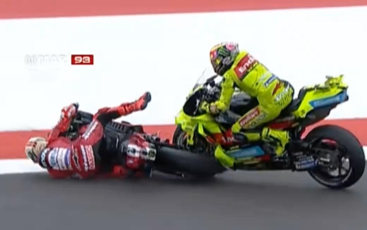 Dopo la caduta causata da Marquez al primo giro, Di Giannantonio fa polemiche ma non dimentica. Marc ammette l'errore e dovrà scontare un long lap penalty
