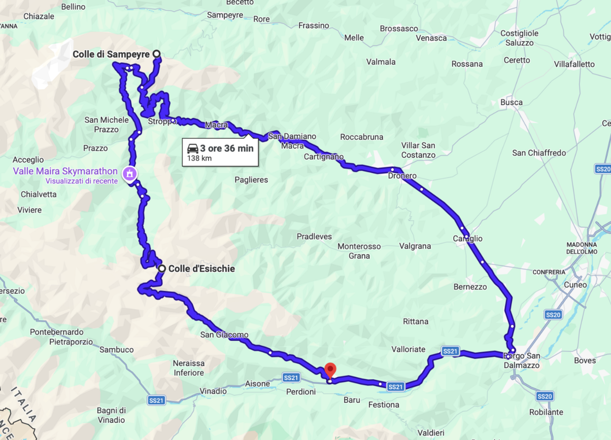 Il rientro su Demonte potrebbe a questo punto passare per la SP335 e, anzichè rientrare sulla SP422 percorsa all’andata, deviare verso sinistra, verso Macra, in direzione di Borgo San Dalmazzo. In questo caso, pur percorrendo comunque la SP422, la si affronta dall’altro lato. La strada è più lunga, ma anche meno impegnativa: per chi è un po’ stanco di curve è forse l’opzione migliore. In totale, avrete percorso un anello di circa 140 chilometri.