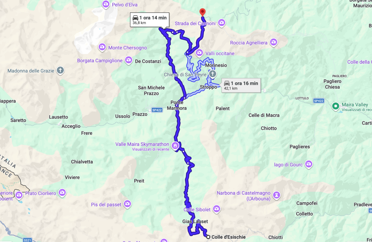 Dal Fauniera, il percorso scende verso la Val Grana, con sosta consigliata a Castelmagno, famoso per il suo formaggio DOP e per il Santuario di San Magno. La strada riprende poi per qualche chilometro salendo verso il Colle d’Esischie (2.370 m s.l.m.), che conduce alla più selvaggia Valle Maira. Puntiamo verso Marmora, aggiungendo una quindicina di chilometri circa e mettendo in conto un buon numero di curve e tornanti stretti: alla lunga può essere stancante, quindi - data anche la necessità del ritorno - il consiglio è quello di prendersela con calma.