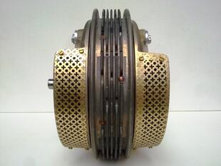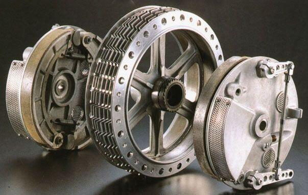 Replica completa di un tamburo Fontana, assemblato e in sezione frontale, in cui si nota l'alettatura di raffreddamento del mozzo centrale.