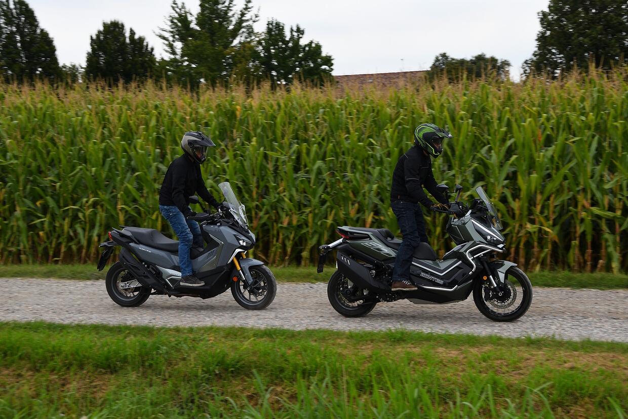 Le due mappature (eco e sport) non cambiano l'erogazione ma danno una diversa risposta in ripresa. Entrambi gli scooter hanno controllo di trazione e ABS posteriori disattivabili, ma la loro azione è diversa: più filtrata sul Sym, più diretta sullo Zontes. In caso di scarsa aderenza tutti e due trasmettono sicurezza e sullo sterrato si guidano bene in piedi. Il Sym è progressivo e rpevedibile, lo Zontes più impegnativo.