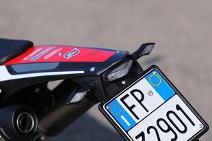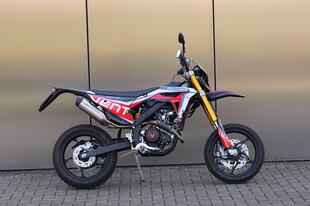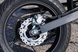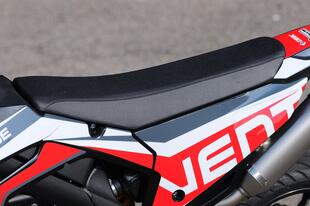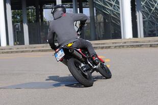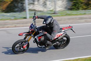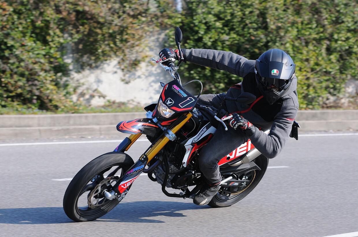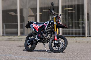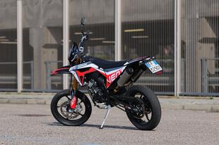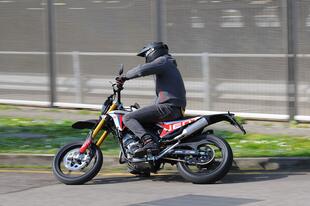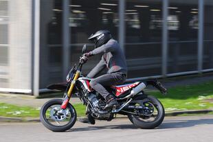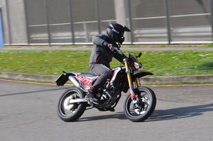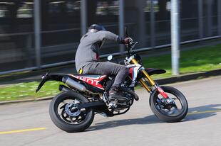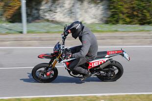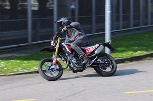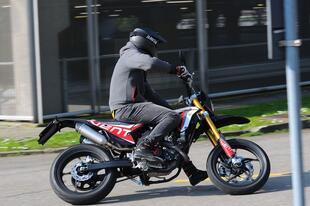 La ciclistica è poi completata da una forcella a steli rovesciati da 41 mm e da un monoammortizzatore regolabile nel precarico vincolato direttamente al forcellone in acciaio. L'impianto frenante, all'anteriore, fa affidamento su disco a margherita da 290 mm morso da una pinza a due pistoncini, mentre al posteriore troviamo un disco da 220 mm e pinza flottante a un solo pistoncino. Non c'è l'ABS, ma la frenata combinata, scelta che permette di destreggiarsi con qualche traverso in ingresso curva. Come le vere motard, le ruote sono entrambe da 17" e i cerchi sono in lega di alluminio a 5 razze. Molto contenuto il peso 111 kg a secco, quindi con il serbatoio da 9,5 litri vuoto.