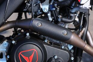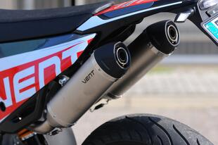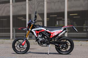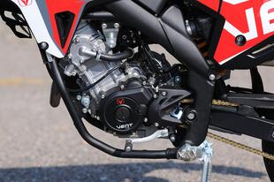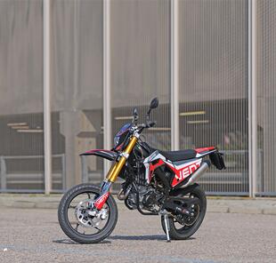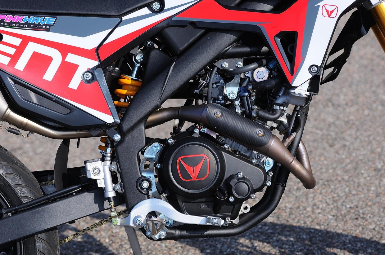 Si fa notare sin da subito per le grafiche appariscenti a tre colori ma il dettaglio più esclusivo che contribuisce a distinguerla dalle concorrenti è il doppio silenziatore che punta in alto in stile 450 da gara. A guardarlo infatti sembra più grande, ma abbracciato dal telaio perimetrale in acciaio c'è un monocilindrico raffreddato a liquido 4 tempi da 125 cm3 firmato Minarelli. Sei rapporti e 15 CV di potenza massima, limite imposto per legge, e fasatura variabile VVA per migliorare la spinta ai medi e bassi regimi.