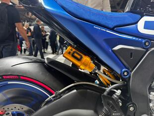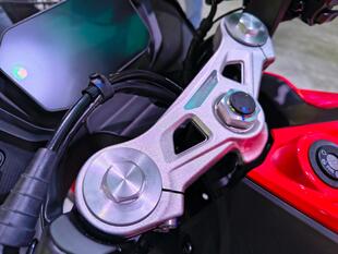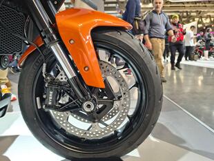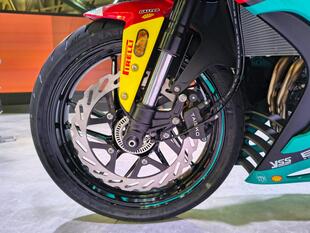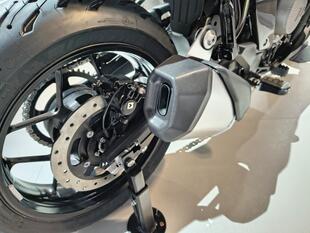 Significa un approccio totalmente diverso e differenze nelle quote della ciclistica e nella forcella, perché il diametro della ruota anteriore comporta diversi valori di avancorsa. Non sono uguali nemmeno i dischi freno anteriori che sembrano di diametro leggermente maggiore, e le pinze, sempre di produzione Bybre a quattro pistoncini e a fissaggio radiale, ma di un altro modello. Cambiano leggermente anche il parafango anteriore e il profilo di carrozzeria che va dal serbatoio al perno del forcellone.