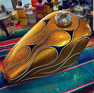 L’evoluzione industriale delle vernici diede ulteriore linfa alla fantasia dei customizer: dalle cromature liquide ai candy colors, passando per le tinte perlate multistrato, il ventaglio delle possibilità si aprì in modo prima impensabile. In questo scenario variegato, molti artisti iniziarono a sperimentare combinazioni di pinstriping e aerografia creando superfici stratificate, composte da linee pulite che incorniciavano mondi dipinti, oppure texture inedite che servono da sfondo per lettering tradizionali.