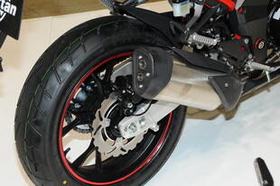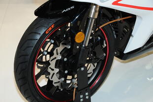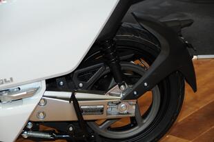 Le ruote sono in lega a cinque razze, l’anteriore di 14†con pneumatico 110/80 e la posteriore di 13†con pneumatico 130/60, e freni a disco su entrambe.