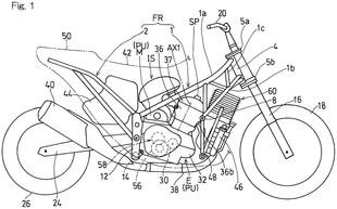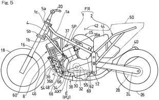 Ora è stato depositato un nuovo brevetto per una disposizione della batteria in posizione più favorevole per il raffreddamento: i disegni che lo accompagnano mostrano un telaio a traliccio nel quale il cannotto di sterzo si spinge più avanti del consueto, mentre il radiatore del liquido di raffreddamento è posizionato più in basso del solito. Nello spazio che si crea viene inserito il pacco batterie, investito da un flusso d’aria decisamente maggiore di quanto non avvenisse sotto la sella. Questo permetterebbe di impiegare senza surriscaldamento per un tempo molto maggiore la funzione E-Boost presente sulle Z7 e Ninja 7 Hybrid, che consente di spingere al massimo contemporaneamente sia il motore elettrico che quello termico. Di contro, portare avanti il cannotto di sterzo significa allungare l’interasse; ma soprattutto un peso notevole come quello delle batterie, situato in una posizione del genere, rischia di rendere lo sterzo pesante e la moto poco maneggevole.