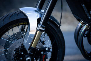 Il manubrio scrambler ha lasciato spazio a semimanubri Battle Factory, mantenendo però i blocchetti originali per non comprometterne le funzionalità . Nuova è anche la pompa freno firmata Brembo, mentre un serbatoio Craftsman e specchi retrovisori firmati 46Works completano la dotazione. Oltre alla pompa freno, l’impianto frenante vede anche nuovi dischi e pinze: all’avantreno il singolo disco di 330 mm è stato sostituito da una coppia di dischi flottanti Sunstar di 280 mm di diametro, abbinati a pinze Brembo. I supporti delle pinze sono ricavati dal pieno e modificati per garantire il corretto funzionamento dell’ABS. Shiro ha inoltre realizzato un parafango anteriore sportivo in alluminio, fissato con staffe nascoste.