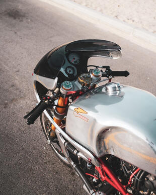 Il cuore della Malavita era in origine un motore Ducati Pantah, ma dire "era" è fondamentale. Questo propulsore ha subito una trasformazione radicale: il cilindro verticale è stato completamente rimosso, e quello rimanente è stato superalesato. Il risultato? Un monocilindrico da 426 cm³ che mantiene l'architettura a L originale, ma con un solo cilindro funzionante. Il telaio che lo ospita è ispirato al mondo delle BMX e sorregge il motore attraverso piccoli supporti. La parte più impressionante, però, è la forcella monobraccio, progettata e fabbricata internamente da Balamutti utilizzando componenti Marzocchi. Non è un lavoro da poco: richiede competenze di progettazione, saldatura e precisione meccanica notevoli. Il forcellone posteriore, anch'esso monobraccio proviene da una Ducati Hypermotard 1100 ed è collegato a un monoammortizzatore Penske. Il manubrio è stato realizzato artigianalmente, mentre la sella arriva da una bicicletta di circa 70 anni fa, completando l'estetica minimalista in stile BMX. La ruota anteriore è a raggi, montata personalmente da Balamutti, mentre quella posteriore proviene da una Ducati 916 ed è equipaggiata con pneumatici Pirelli MT60.