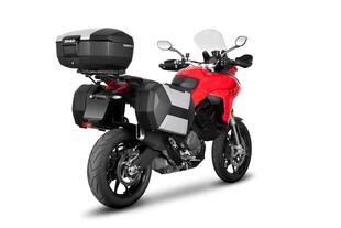 Le borse della Multi hanno diversa capacitĂ (35 lt la sinistra, solo 25 la destra) e non sono troppo sporgenti. Nessun pomello per regolare il mono: basta un tasto al manubrio per cambiare lâassetto della Multistrada V2 S Travel. Nellâallestimento Travel è compreso il cavalletto centrale, piĂš sicuro del laterale nelle soste a pieno carico e per eseguire piccoli interventi di manutenzione.