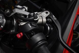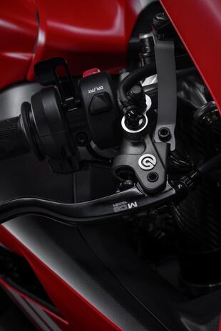 L’uso dei due dischi freno anteriori in carbonio di 340 mm Ø ha consentito di risparmiare 900 grammi rispetto ai due dischi in acciaio di 330 mm Ø della Panigale V4, con una riduzione del momento di inerzia del 40% che si traduce in una maggiore agilità della moto; le due nuove unità Brembo, realizzate attorno a un nucleo in materiale CSiC, composto ceramico rinforzato con fibra di carbonio, ovviamente garantiscono anche una grande efficienza a temperature elevate. Sono accoppiate a nuove pinze monoblocco ricavate dal pieno con alette di raffreddamento integrate e quattro pistoncini differenziati di 30 e 34 mm Ø.