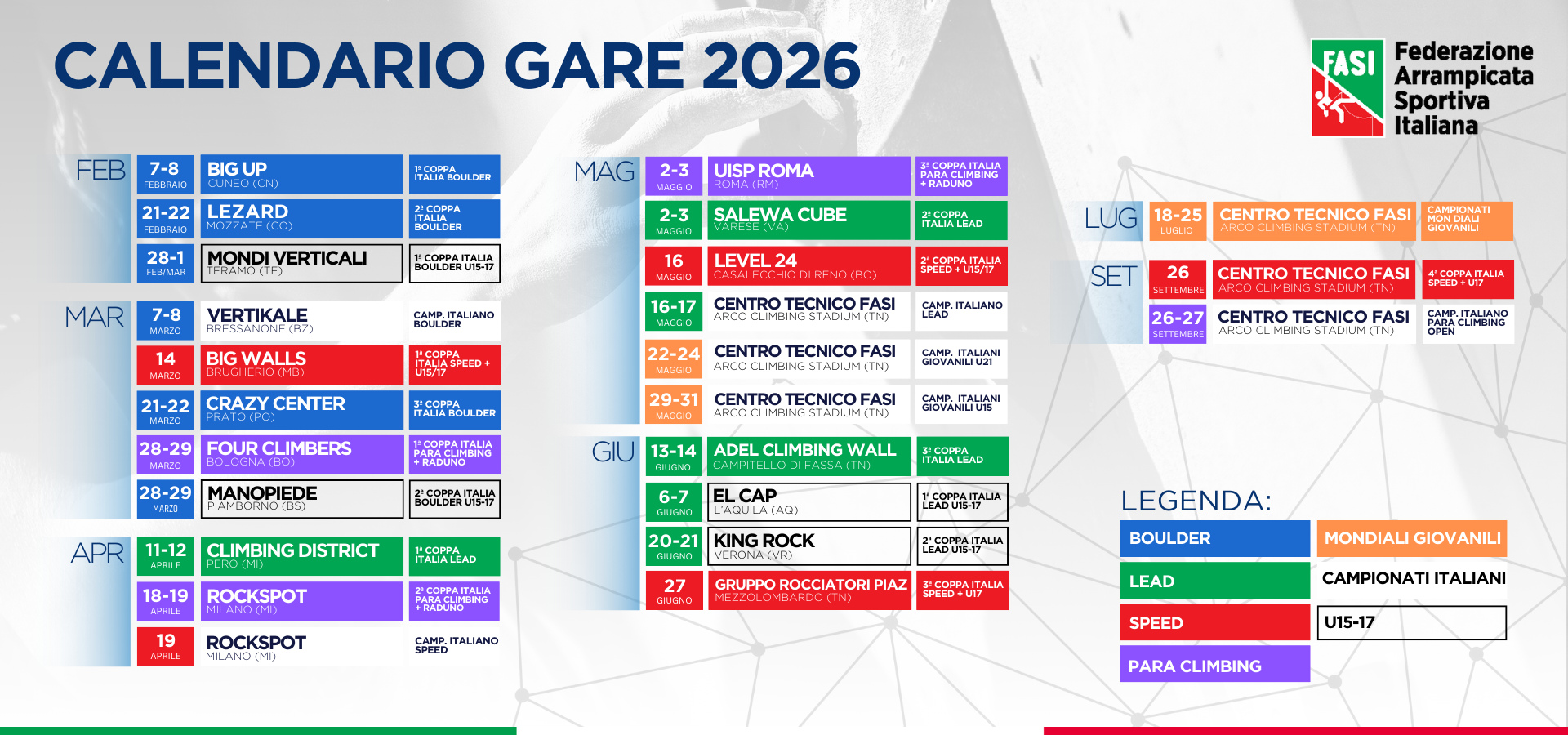 I Campionati Italiani delle varie specialità saranno così organizzati: il 7-8 marzo si disputerà il Campionato Italiano Boulder a Bressanone (Vertikale), il 19 aprile il Campionato Italiano Speed a Milano (Rockspot), il 16-17 maggio il Campionato Italiano Lead presso il Centro Tecnico FASI Arco Climbing Stadium, infine il 26-27 settembre il Campionato Italiano Para Climbing anch’esso ad Arco, che segnerà la conclusione della stagione agonistica 2026.