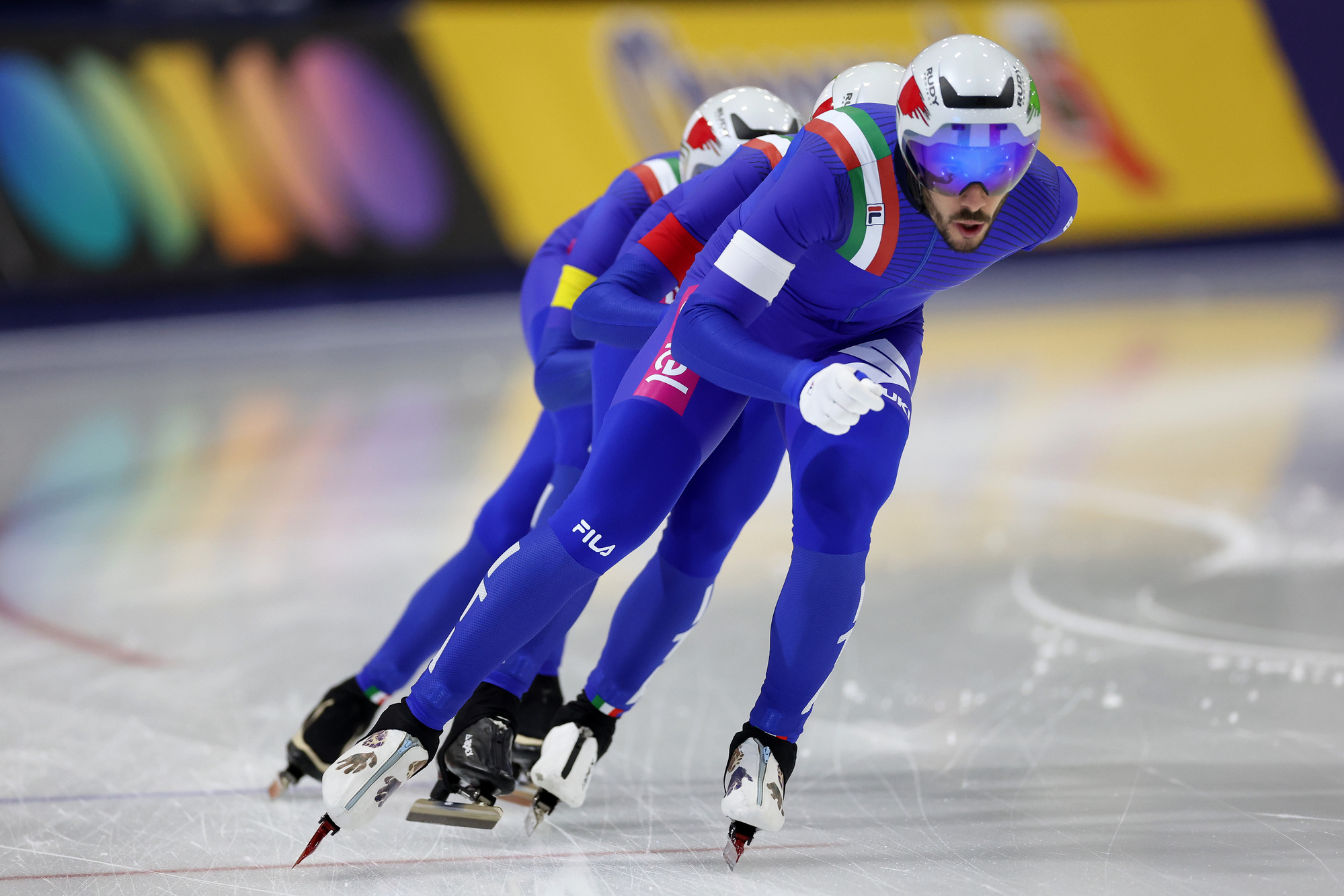 Mass Start maschile – Andrea Giovannini (Fiamme Gialle) è salito sul terzo gradino del podio, districandosi egregiamente nel traffico nelle fasi conclusive per emergere nello sprint finale della gara vinta dallo statunitense Jordan Stolz davanti al belga Bart Swings. Il trentaduenne azzurro è peraltro secondo nella classifica di specialità della partenza in linea, da lui vinta nelle ultime due stagioni, con 22 punti di ritardo dall’olandese Jorrit Bergsma, oggi quarto.